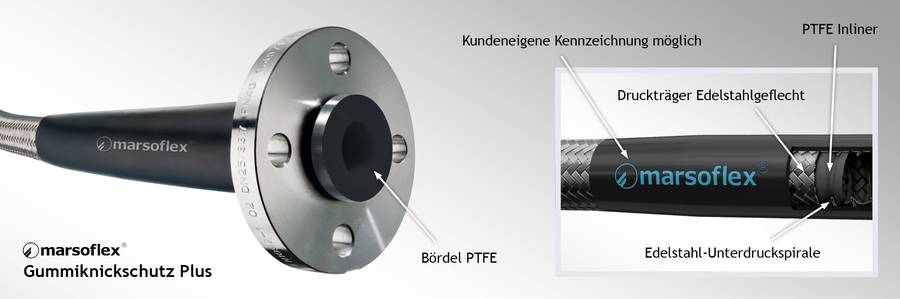 Der Gummiknickschutz Plus zeichnet sich besonders durch seine Widerstandsfähigkeit gegen Alterung, UV- und Witterungseinflüsse, Ozonangriff sowie durch Flammwidrigkeit (selbstverlöschendes Material) aus. Er verstärkt den Übergang von Armatur zu freiem Schlauch und verringert somit die Knickanfälligkeit in diesem besonders gefährdetem Bereich. Durch Vulkanisation wird dabei eine bestmögliche Anhaftung erlangt. Somit verlängert der Knickschutz die Lebensdauer des Schlauches und verhindert Störungen im Arbeitsprozess. Der Gummiknickschutz Plus besteht aus Chloropren-Kautschuk (CR-ableitfähig).