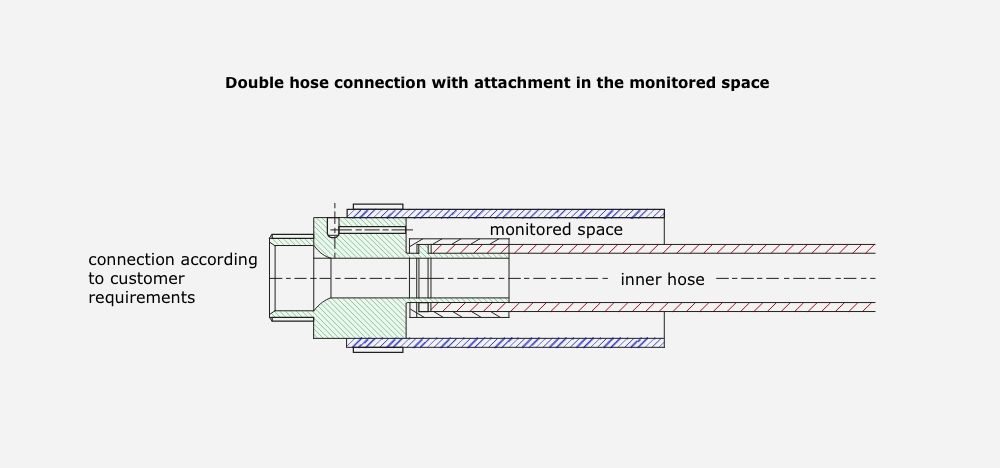 The inner and outer hoses are individually designed for the properties of the medium being transported. The connections are also specifically designed for the geometry required on the system side. A special connector is made to customer specifications for assembling the double hose system.