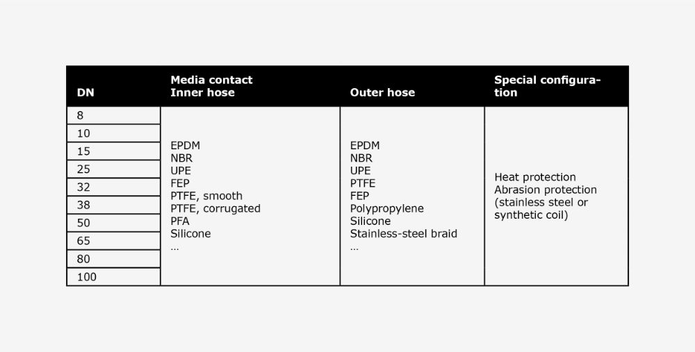 With regard to the selection and configuration of hose materials, the following criteria and parameters apply as a rule: