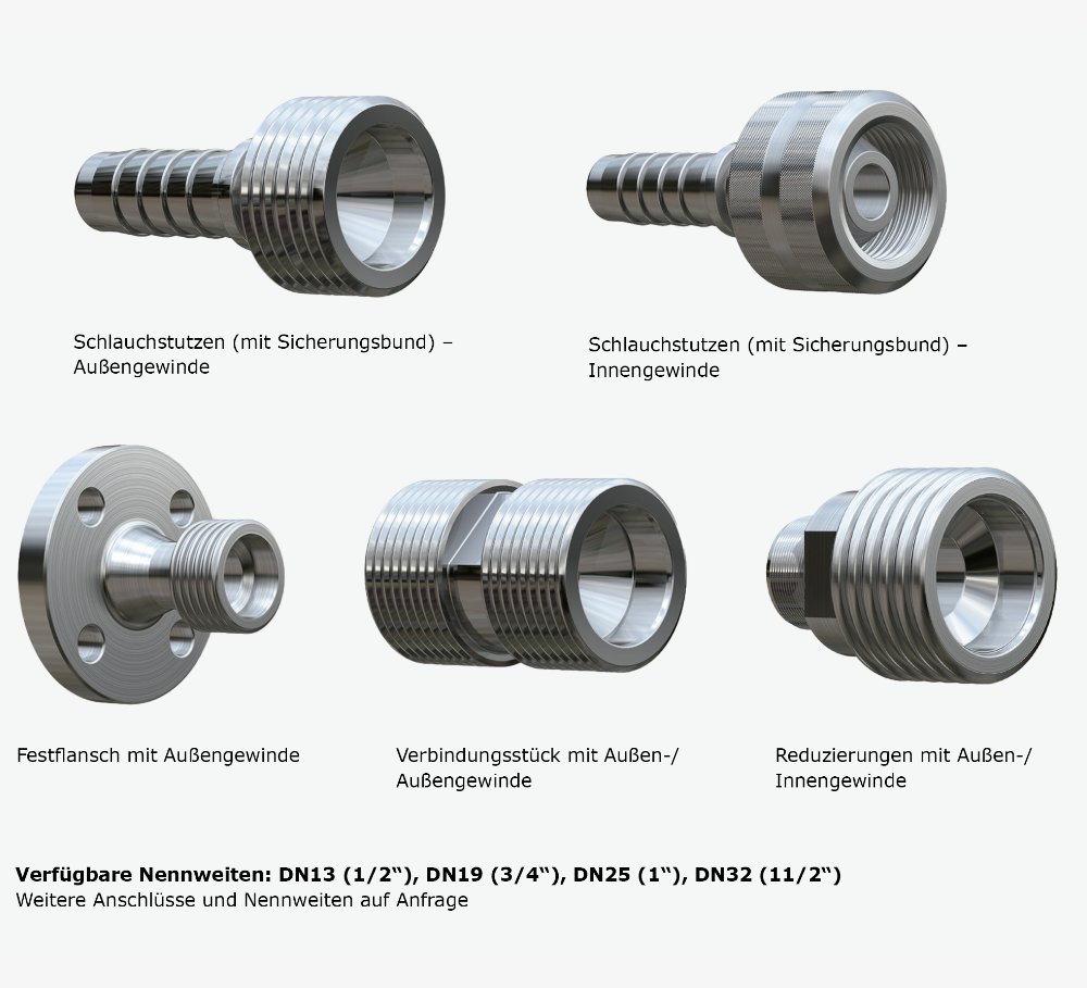 Dampfverschraubungen für Schlauchleitungen gewährleisten den sicheren und effizienten Transport von Dampf. Sie sorgen für eine zuverlässige Verbindung in dampfbetriebenen Systemen und verbessern dadurch die Betriebssicherheit und Energieeffizienz.
