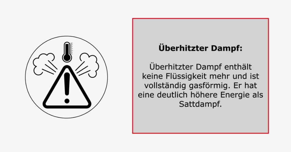 Der Kontakt mit Dampf kann zu schweren Verbrennungen führen. Besonders überhitzter Dampf kann bei Druckabfall explosionsartig expandieren und große Energiemengen freigeben. Wenn Dampf plötzlich kondensiert, entsteht ein Vakuum, wodurch sich Leitungen verformen oder sogar kollabieren können.